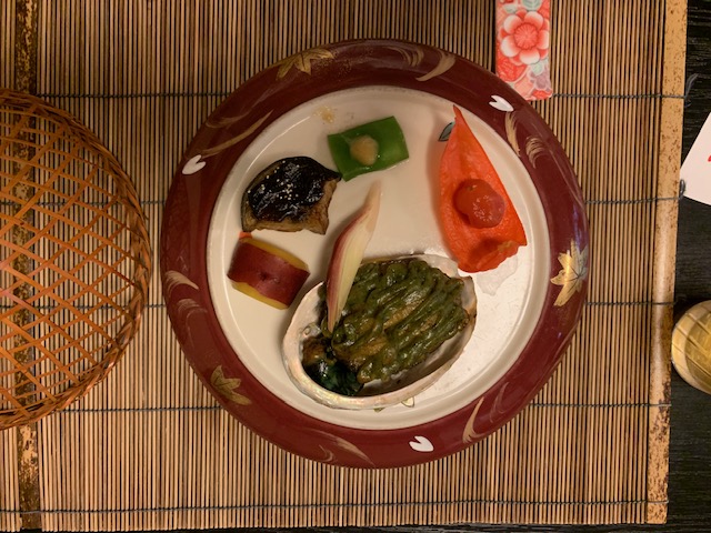 ビールで喉を潤しながら、お刺身やアワビ料理を味わいました。