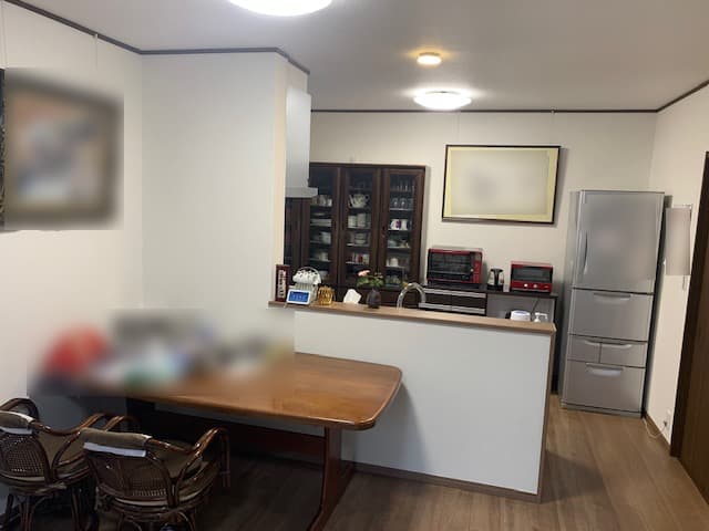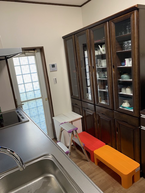 ⑥:危険になりやすい 吊り戸棚は撤去。代わりに安全な踏み台を施主側で用意