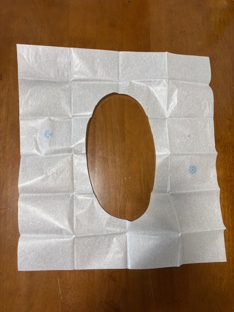 便座の上に広げて、青い紋様を指で押すと、引っ付きます。