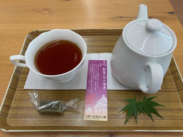 ▲吉野ヶ里遺跡の食堂でいただいた紅茶と抹茶羊羹