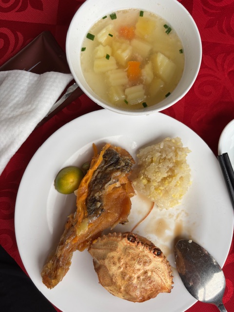 昼食は船内で海鮮料理。飲み物にスプライトを注文し、料理が運ばれてきました。近郊の新鮮な野菜と海鮮を、船内で調理してアツアツを出してくださるのでとても美味しかったです。