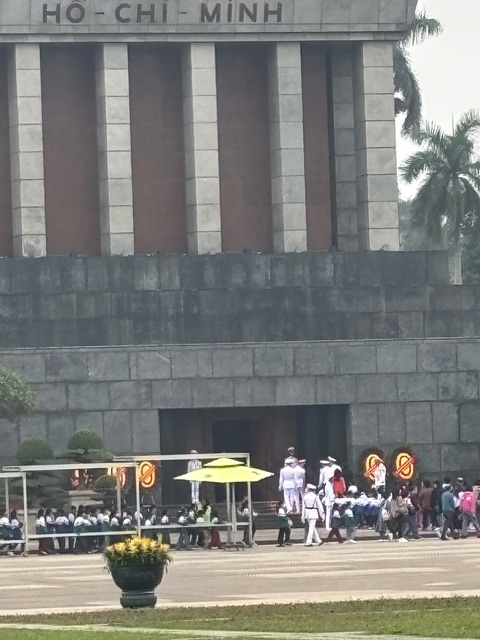 1945年にホーチミンさんが独立宣言を読み上げた場所に建てられ、軍人が厳重に警備し、観光客だけでなく多くの地元のベトナム人も、私語厳禁で整然と列をなして参拝します。
