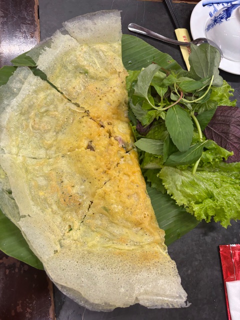 バインセオとは、日本ではベトナム風お好み焼きです。欧州ではベトナム風クレープと呼ばれる、南部の粉物料理です。とても食べやすい料理で美味しくいただきました。詳しくは別ブログで紹介します。
