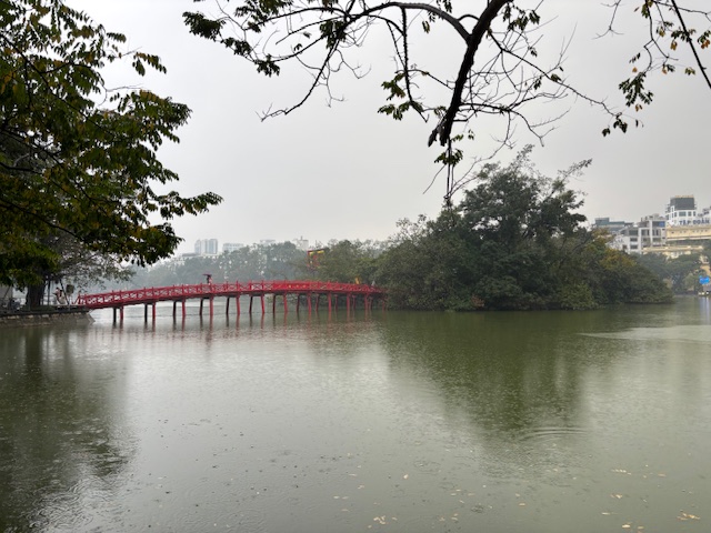 「天気女」の私にとって、海外旅行で初めての雨でした。乾季ですので、ウインドブレーカーを頭から被り、ショルダーバッグは中に入れたら濡れることはありませんでした。流石にユニクロ製品は凄いです。他の製品は雨水が流れて膝が濡れて冷たくなりますが、ユニクロは付着した雨水が流れずバラバラに落ちるので、腿のあたりが濡れませんでした。快適な雨天を過ごしました。ハノイの中心に位置する「ホアンキエム湖」は落ち着いた雰囲気で、街のオアシスのようでした。
