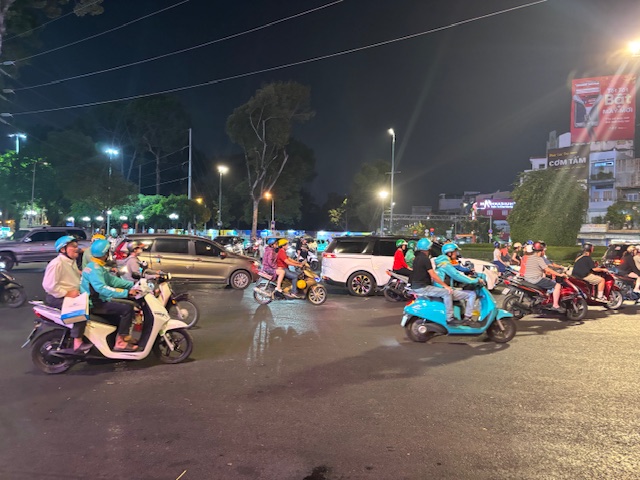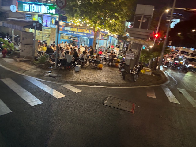 水色のバイクは、タクシーバイクだそうです。デパートや野外カフェもあり、下の写真は海鮮料理の居酒屋で満席でした。「東南アジアに来た」という実感が湧きます。